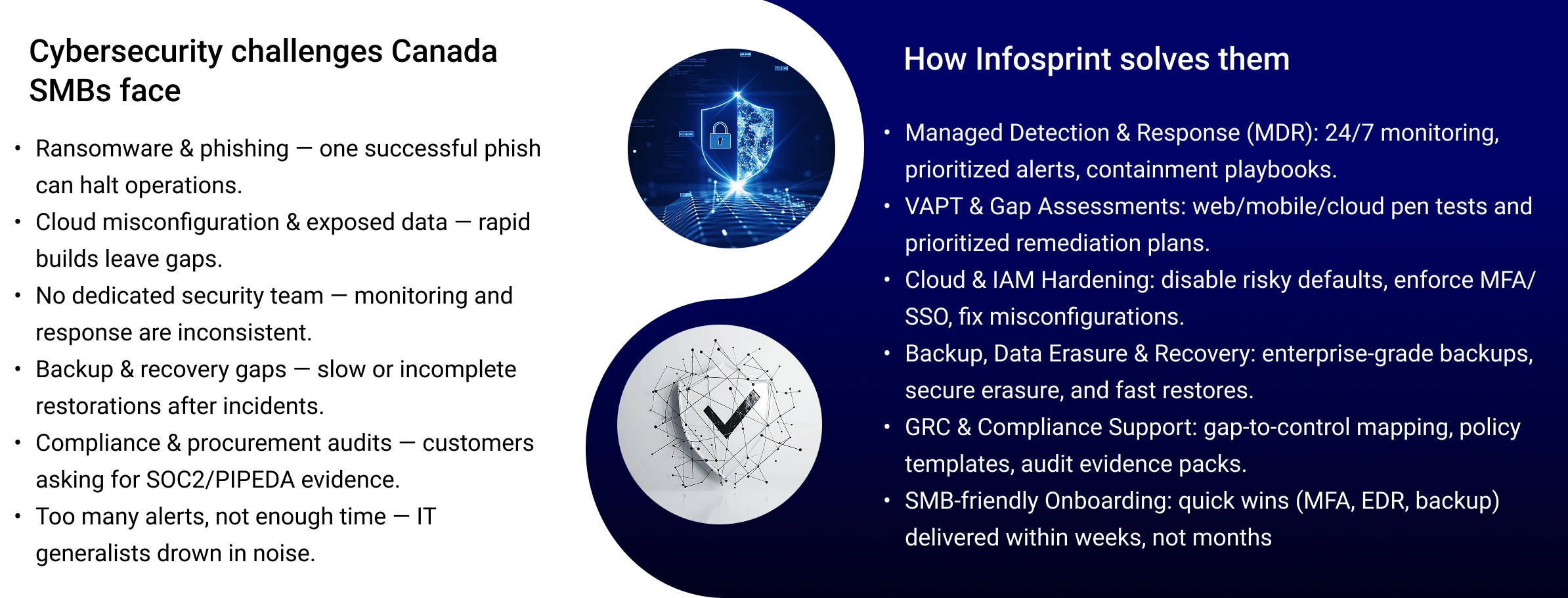 Cybersecurity is no longer optional for Canadian SMBs and startups across healthcare, retail, financial services, legal, real estate, logistics, SaaS, and professional services. Organizations handling sensitive data or serving enterprise clients face increasing pressure to demonstrate strong security controls and compliance readiness. Infosprint delivers effective, PIPEDA-aligned security solutions that help prevent disruptions, protect customer trust, and meet evolving regulatory and partner expectations.